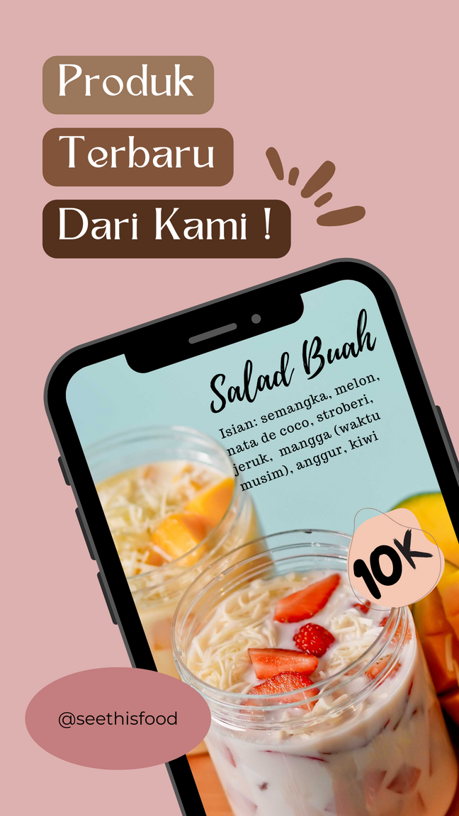 Salad buah merupakan salah satu makanan sehat dari berbagai potongan buah dan saus salad dari yogurt, mayonaise, dan sirup. Banyak orang ingin menjaga kesehatan dengan makanan-makanan sehat dan praktis. See this food hadir dengan menu baru “SALAD BUAH” untuk memanjakan kalian konsumsi makanan sehat yang praktis.